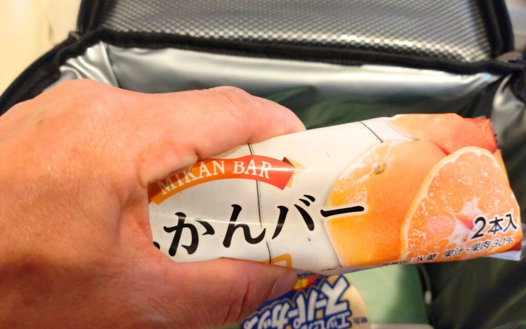 スーパーカップのバニラと木の棒がついたみかんバーです。